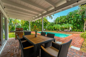 A true vacation oasis with a heated pool, lush tropical landscaping, a basketball net, and an alfresco dining area perfect for gatherings.