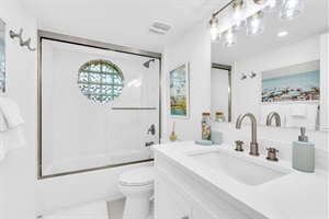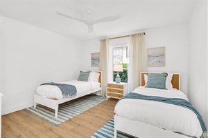 This surfside-themed bedroom is a great space for kids/ or teens. The bedroom has two contemporary-designed twin platform beds imported from Scandinavia. The beds are topped with LUCID aloe gel memory foam mattresses, and luxurious hotel-quality cotton linens, and topped with jute-woven two-toned blue pillows. There is an elegant molding design white dresser with gold knobs, that sits under a 32" Fire TV and a Tommy Bahama roped gold table lamp. A white and cane oversized end table sits between the beds, topped with a porcelain light blue lamp. There is a USB port, closet space, luggage rack, and beautiful bamboo round mirror. The room and en-suite bathroom are decorated with surf and beach-inspired artwork.