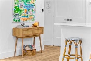 Upon entry, you are welcomed by an oversized Studio McGee natural woven rattan mirror. A light oak and rattan console table sits beneath a colorful custom-sized Katie Herman "Happy Places" print, and fun Florida books. Under the console lies a cane rattan basket filled with 100% Turkish cotton beach towels.