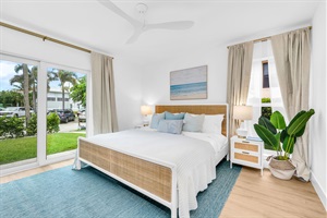 The primary bedroom suite is coastal "Serena & Lily" inspired. The king bed is a mango wood platform bed with a woven cane head and footboard in a natural finish, topped with a LUCID aloe gel memory foam mattress and 100% luxurious cotton linens. The bed sits on a coastal SAFAVIEH blue indoor/ outdoor rug, there are 2 white-finished end tables, porcelain glass lamps, a modern white dresser topped with a soft-blue ceramic lamp, USB ports, luggage racks, a 32" Fire TV, and closet space. The room has a private screened sliding door to the front of the condo, which brings in beautiful natural light, and blackout curtains. The bedroom and en-suite bathroom are thoughtfully decorated with large mirrors and coastal artwork. The bed is dressed in a Deauville striped cotton blanket in three blue hues and soft blue throw pillows.