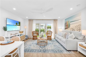 This designer living room is an open space for family and friends to share conversation, play "Florida-poly" or the Gray Malin Backgammon board, read an array of coastal and tropical books, or enjoy your favorite shows on the large 65" TV. The furnishing is a mix of woven rattan and coastal elegance. Upon the Tucson oriental hand-woven area rug, is a large queen sleeper sofa with a comfortable memory foam mattress and luxurious 100% cotton linens and a white quilt. There are 2 swivel rattan armchairs for easy viewing of the whole space, a Tommy Bahamas oven rope gold standing lamp, and a natural rattan coffee table with an elegant design topped with Gray Malin beach-inspired coffee table books. The sheer draped sliding doors open to the front of the condo, which gives you easy access to the path to the beach, and views of the lush landscaping. A unique feature is the massive surf-inspired artwork above the sofa, and the wide windows bringing in natural radiant lighting.
