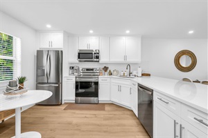 A beautifully designed spacious and modern kitchen with white shaker cabinets, marbled quartz countertops, stainless steel appliances, ice maker and fully equipped with everything you need to serve 6 - 8 guests. Enjoy filter coffee or pod with the Hamilton Beach FlexBrew Trio 2-Way Coffee Maker, brew some tea using the Rae Dunn kettle, or enjoy other appliances such as the Cuisinart toaster, Hamilton Beach Wave Crush blender, and Mueller hand mixer. Kids can use the Wheatstraw dinner service. This kitchen is designed for anyone who loves to cook and entertain.
