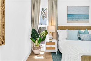 The modern white table seats 4 for intimate dining, There are 4 natural cane dining chairs to add to that coastal flair and an impressively large round rattan "sun" mirror that centers over the dining table. There are 5 sky-blue rattan bar stools at the impressively large quartz kitchen counter. The kitchen also has a kitchen nook with 2 upholstered rattan and cane benches, a modern contemporary white round table, and a decorative Fiddle tree, which sits alongside a surf-scene art piece.