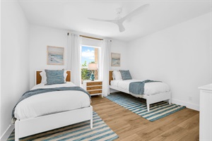 This surfside-themed bedroom is a great space for kids/ or teens. The bedroom has two contemporary-designed twin platform beds imported from Scandinavia. The beds are topped with LUCID aloe gel memory foam mattresses, and luxurious hotel-quality cotton linens, and topped with jute-woven two-toned blue pillows. There is an elegant molding design white dresser with gold knobs, that sits under a 32" Fire TV and a Tommy Bahama roped gold table lamp. A white and cane oversized end table sits between the beds, topped with a porcelain light blue lamp. There is a USB port, closet space, luggage rack, and beautiful bamboo round mirror. The room and en-suite bathroom are decorated with surf and beach-inspired artwork.