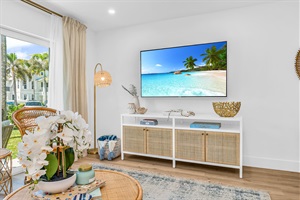 This designer living room is an open space for family and friends to share conversation, play "Florida-poly" or the Gray Malin Backgammon board, read an array of coastal and tropical books, or enjoy your favorite shows on the large 65" TV. The furnishing is a mix of woven rattan and coastal elegance. Upon the Tucson oriental hand-woven area rug, is a large queen sleeper sofa with a comfortable memory foam mattress and luxurious 100% cotton linens and a white quilt. There are 2 swivel rattan armchairs for easy viewing of the whole space, a Tommy Bahamas oven rope gold standing lamp, and a natural rattan coffee table with an elegant design topped with Gray Malin beach-inspired coffee table books. The sheer draped sliding doors open to the front of the condo, which gives you easy access to the path to the beach, and views of the lush landscaping. A unique feature is the massive surf-inspired artwork above the sofa, and the wide windows bringing in natural radiant lighting.
