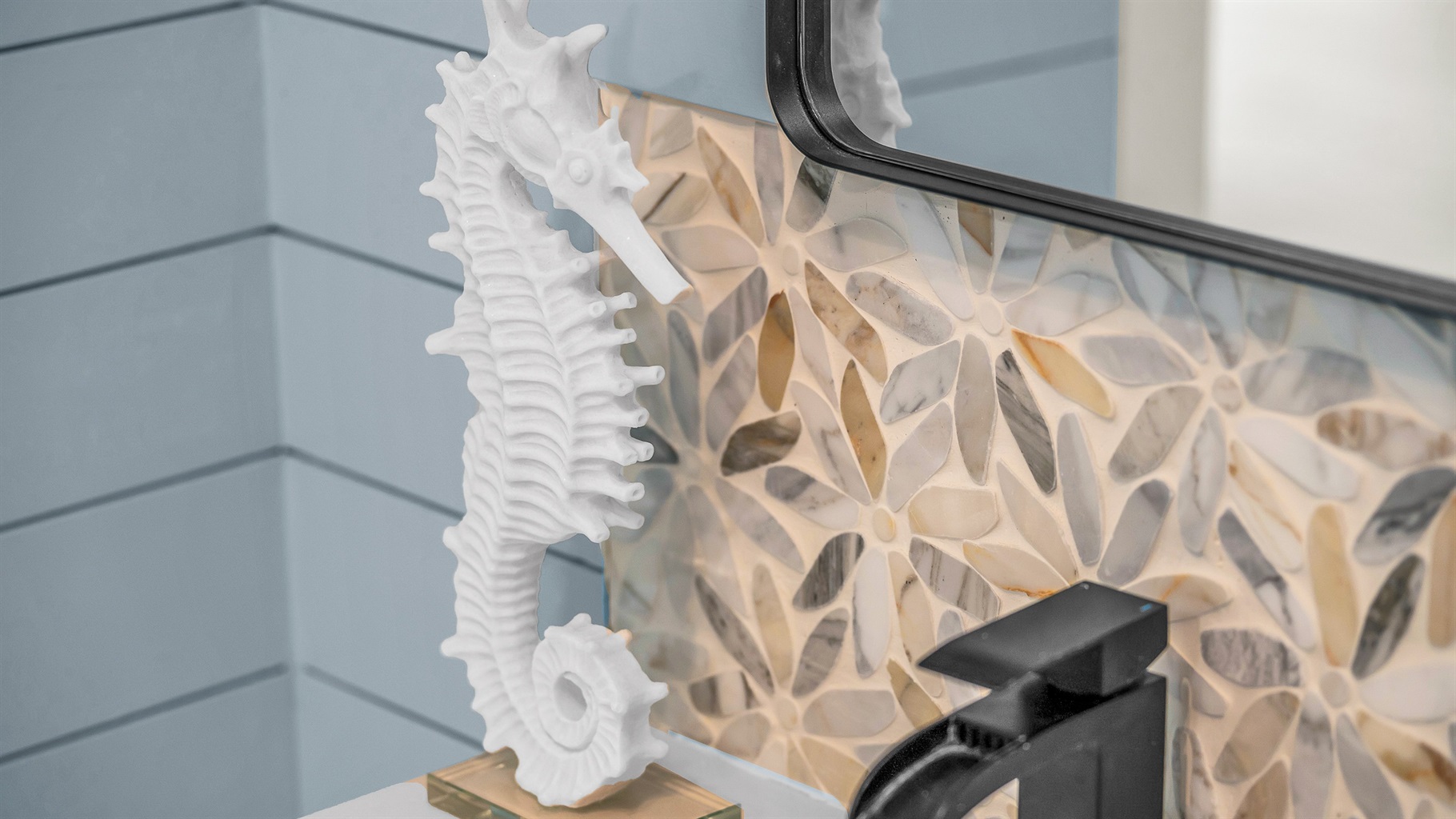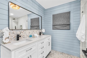 Primary Bathroom: This spa-inspired bathroom features sleek coastal design with a walk-in glass shower, modern fixtures and soft natural light- creatig a serene retreat for relaxation and rejuvenation