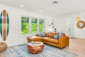 The bright and airy living room features a modern leather sectional, warm wood accents, and lush greenery views through large picture windows. Stylish touches like the surfboard décor and geometric coffee table create a relaxed coastal vibe.