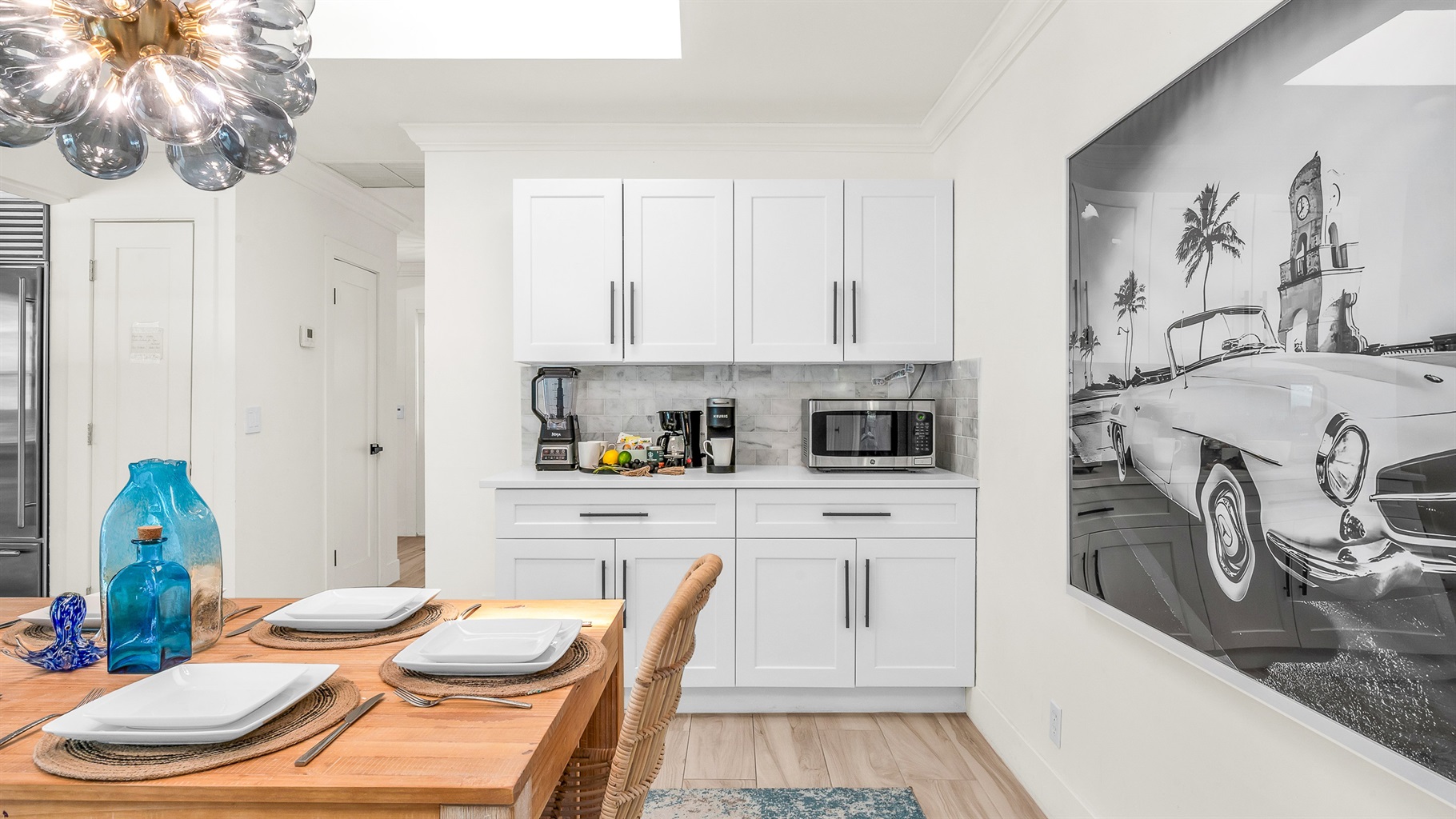 Gather around the rustic wood dining table with seating for six, accented by chic rattan chairs and a statement chandelier. Surrounded by natural light and stylish coastal décor, it’s the perfect space for enjoying meals or entertaining in style.