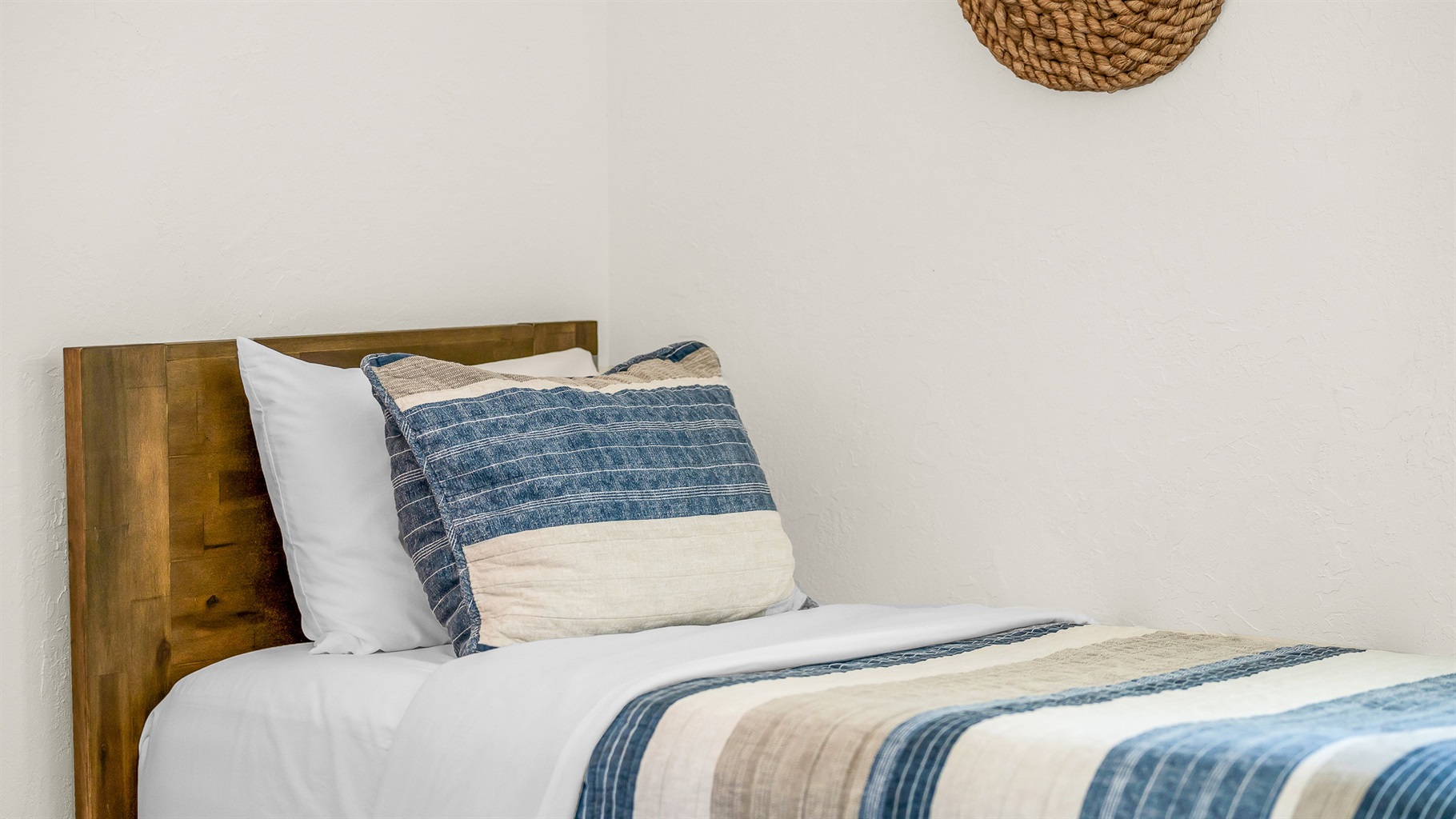 Bedroom 3 features bright coastal decor, crisp white linens, and pops of ocean blue- creating a serene and cheerful retreat for guests to relax and unwind in comfort.
