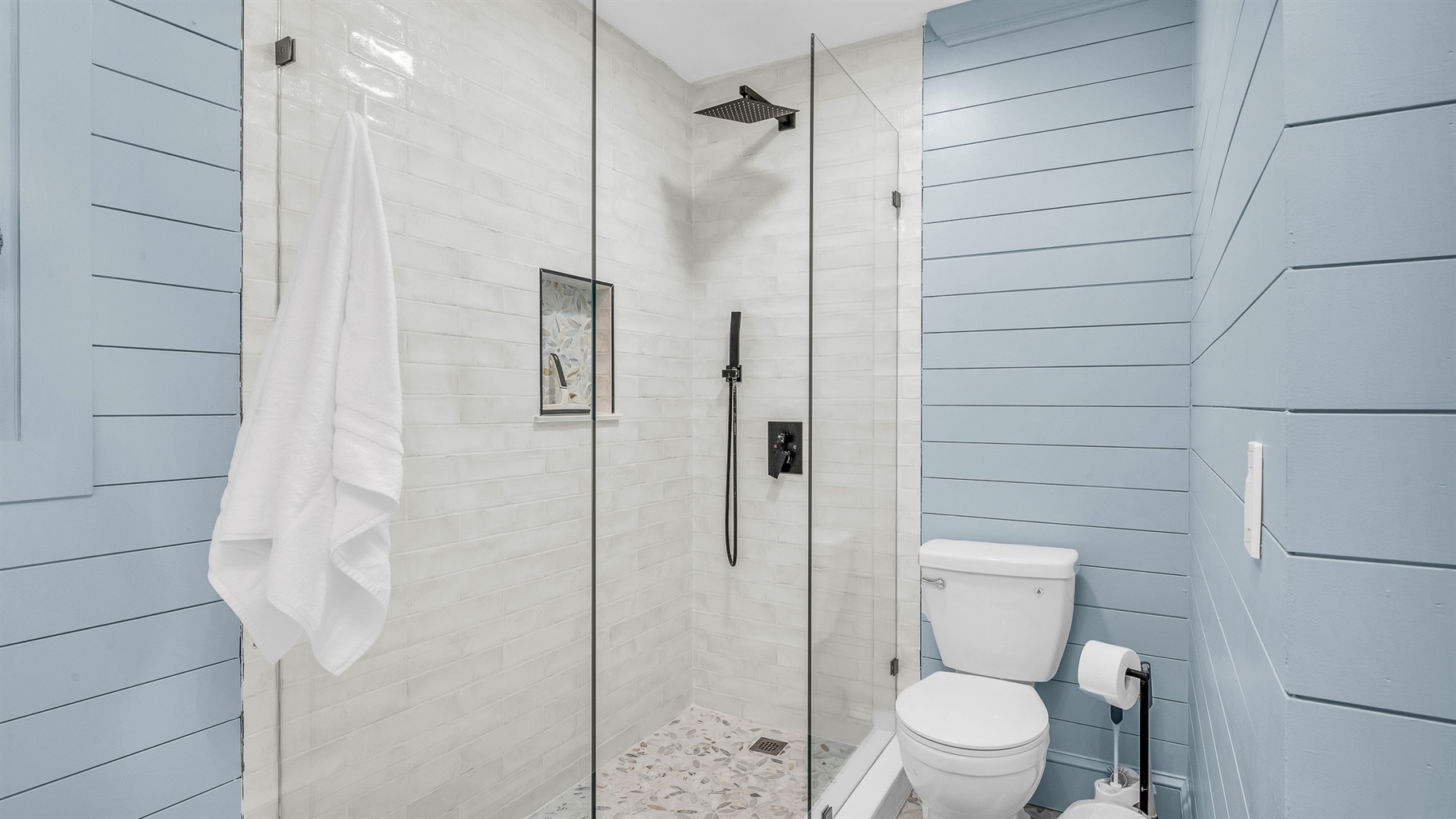 The second bathroom combines coastal charm with modern style, featuring blue shiplap walls, matt black fixtures, and a bright, airy design that brings a refreshing spa-like feel to the space