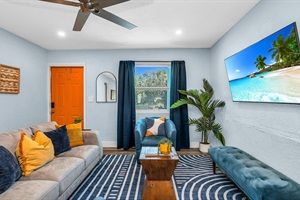 The living room is the heart of the home, offering a smart streaming TV and cozy seating for movie nights, games, or laid-back lounging after a day in the sun.