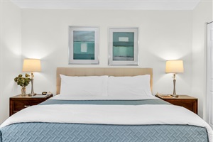 This luxurious primary suite has a king bed, with a high upholstered headboard, and outstanding views of the canal from the oversized window. There is an armchair, and a walk-in closet, a TV with cable, and safe for personal items. The primary suite has a private bathroom attached.