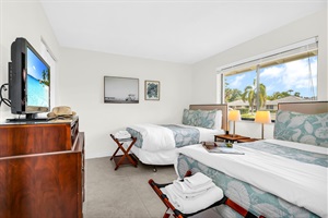 This comfortable space has 2 full beds with soft white linens, and topped with coastal quilts. The bedroom has a TV, luggage racks, and a spacious closet. This is the perfect room for families with kids/teens to have their own private space.