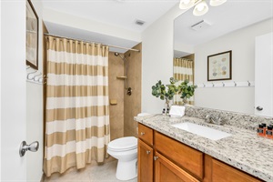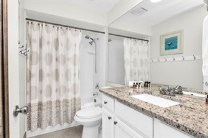 This bathroom sits just outside the 2nd bedroom. The bathroom has a step-in shower and single granite finished vanity. Fresh luxurious towels are provided.
