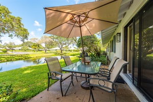 Entertain in this splendid outdoor space with a 4-seater dining table under an umbrella, a propane-gas grill, and two sun loungers with views of the tranquil waterway.