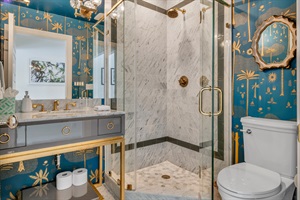 3. 3rd Bathroom: Marble-designed shower with golden fixtures.