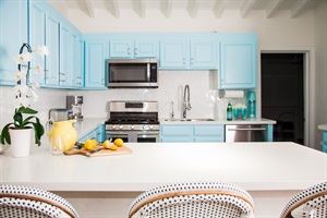Fully equipped with stainless steel appliances and bamboo seating for four, this kitchen combines functionality with elegance.