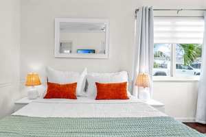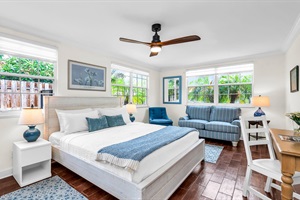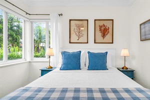 Queen bed with plush pillows, coastal artwork, and corner windows framing lush palms. Peaceful and private.