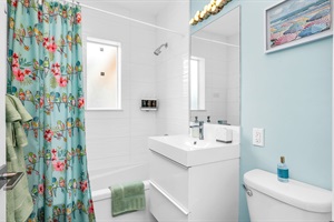 Bright and fun with a coastal twist, featuring a tub/shower combo, updated vanity, and playful accents.